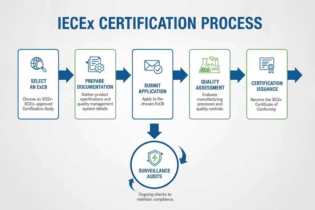 Once requirements are met, the certification body issues IECEx certificates, recognized worldwide as proof of compliance. Certificates are listed in the IECEx online database for easy verification. Regular audits ensure ongoing compliance with IECEx standards.
